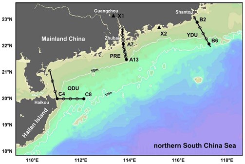 图1. 南海北部陆架海区调查断面及船基培养实验站位