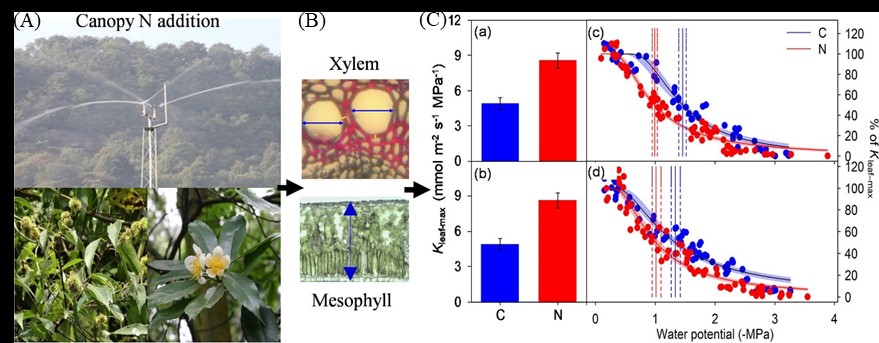 中科院华南植物园生态与环境科学研究中心张统博士在叶清研究员的指导下,利用广东石门台林冠模拟氮沉降实验平台,以植物叶片水分关系为切入点,探讨了亚热带森林两种优势树种(锥和木荷) 叶片水力性状对林冠氮添加的响应。研究发现,由于叶片厚度、导管直径和强度的改变,氮添加显著增加了这两种植物的叶片导水率和蒸腾速率,同时降低了叶片的抗旱性。因此,大气氮沉降加剧可能增加森林植物的水分消耗以及植物对干旱的脆弱性。