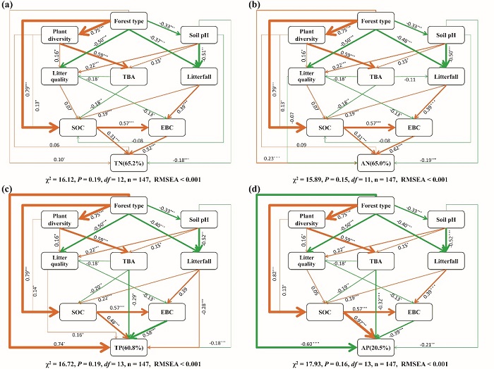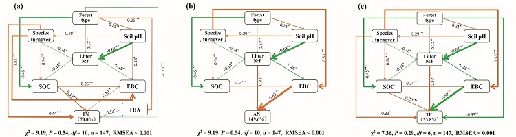 研究结果表明,植物多样性和物种周转速率随着森林演替而增加,且两者都改变了土壤氮、磷的有效性。高的植物多样性通过提高群落生产力、改变凋落物质量以及影响土壤理化性质对土壤氮、磷的有效性产生了积极影响。然而,土壤氮、磷对物种周转的反应不同。土壤全氮(TN)和有效氮(AN)与物种周转呈正相关,而土壤全磷(TP)与物种周转呈负相关,表明森林演替过程中物种周转可能会导致土壤氮、磷供应的失衡。该研究结果为土壤氮、磷有效性与植物多样性的非单一线性关系提供了可能的解释,即土壤氮、磷有效性受到物种多样性和物种周转的共同调节。