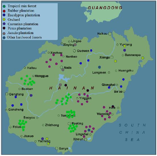 森林土壤中的碳(C)、氮(N)和磷(P)是三个重要元素,研究其C:N:P化学计算比对我们更好地理解森林土壤养分并为森林管理提供有价值的参考。中科院华南植物园生态与环境研究中心任海研究员与美国田纳西州立大学的惠大丰教授以及海南大学、海南师范大学等单位同行合作,利用C专项期间对海南岛热带雨林、桉树人工林、橡胶林、木麻黄林、针叶林和果园的100个样地(图1)的土壤测定数据,研究了海南岛热带森林土壤C:N:P化学计量比的空间和垂直变化。结果发现:(1)土壤C、N含量和土壤C:P比、N:P比由表层土壤向深层土壤均呈下降趋势,土壤P、C:N比值在不同土层间变化较小,这主要是因为土壤C、N主要受光合作用、N2固定等生物过程控制,而P受基岩影响较大。(2)土壤C、N、P含量及它们的比率的空间变异性较大,土壤C、N含量受经度和植被影响显著,而土壤P含量、C:P比和N:P比受纬度影响显著(图2)。这些结果对理解海南岛森林的化学元素计量比、生态系统生产力、植物与环境间的关系有重要参考价值,也为改进生态系统模型提供了新参数。