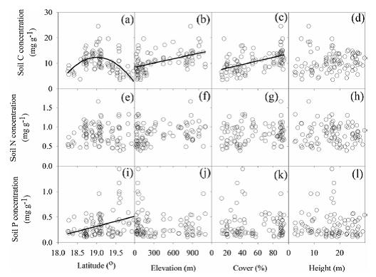 图2. 土壤的C、N、P含量与经度、纬度、海拔、植被覆盖和树高间的关系。