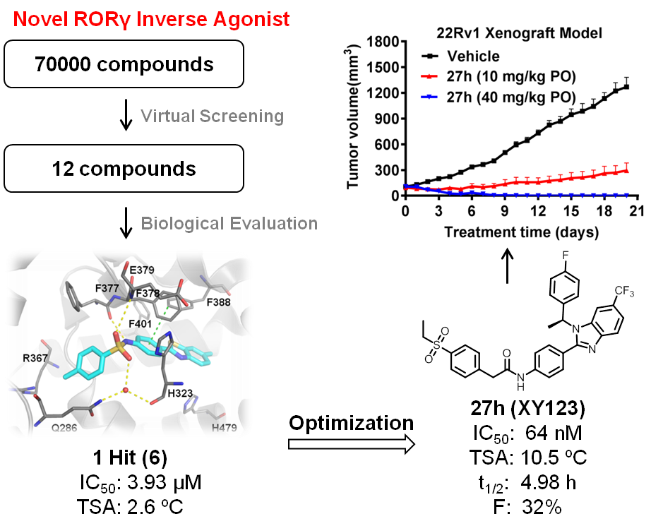 近期,该团队通过虚拟筛选、基于结构的药物设计和构效关系研究,获得了一系列苯并咪唑类RORγ小分子抑制剂,这些化合物对RORγ表现出显著的抑制活性。代表性化合物XY123可有效抑制RORγ的转录活性(IC50 = 64 nM),增强RORγ-LBD的热稳定性(ΔTm = 10.5 °C)。同时,XY123具有优越的选择性、良好的代谢稳定性和药代动力学特性(t1/2 = 4.98 h,F = 32%)。另外,XY123也开展了前列腺癌活性评价及克服耐药机制研究。结果显示,XY123可以抑制多种前列腺癌细胞的增殖与克隆形成,同时可有效抑制前列腺癌细胞中AR调控的下游基因的表达。XY123还可有效抑制前列腺癌细胞中AR全长和AR突变体的表达。在22Rv1异种移植的前列腺癌小鼠模型中,通过口服给药XY123可实现肿瘤的长期完全消退。XY123可作为一个有前景的先导化合物用于前列腺癌及其临床耐药药物的开发。