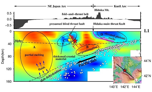 研究人员采用多参数联合反演技术,通过对大量的海-陆联测地震波走时数据联合反演,获得了日本北海道俯冲带的壳-幔三维多参数结构。研究结果表明,由于日本东北岛弧(NE Japan arc)与千岛群岛岛弧(Kuril arc)的剧烈碰撞,在背弧区形成了低速-高速-低速的类似三明治构造的深部速度结构特征,而2018年北海道6.6级主震发生在三明治构造的高-低速度变化的边界,余震都位于高速度区域,并且在主震的左侧存在一个来自上地幔的显著的低速度和高泊松比异常体。研究认为该深部构造特征主要是由弧-弧碰撞及俯冲板块的脱水联合作用引起的。由于来自俯冲板块脱水作用的流体不断被挤入到震源区的高-低速度过渡带,其流体应力不断升高,导致其高速度的刚性块体的岩石机械强度降低,从而引起岩石脆性形变而诱发地震。