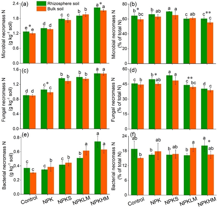长期施肥处理下水稻根际土和非根际土中微生物残留物氮含量及其占全氮的比例