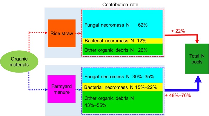 中国科学院亚热带农业生态研究所苏以荣研究员团队基于31年长期施肥定位试验,研究了有机物料(水稻秸秆和有机粪肥)替代部分化肥下水稻土中微生物残留物积累特征,并计算了化肥有机替代下土壤氮积累的增量来源。结果表明,有机物料替代显著增加了微生物生长速率,促使总微生物生物量增加,进而微生物残留物积累增加,这是化肥有机替代促进土壤氮积累的重要来源之一。具体来说,有机肥替代30~60%化肥比单施化肥的土壤全氮增加48~76%,这部分氮素增量中微生物残留物与植物残体贡献相当,其中真菌残留物贡献30~35%、细菌残留物贡献15~22%、未被微生物利用的植物碎屑贡献为43~55%;秸秆还田比单施化肥增加的22%全氮中,微生物贡献(74%)远大于植物残体(26%),其中真菌残留物贡献高达62%。因此,有机肥和秸秆两类有机物料均能有效促进土壤氮积累,但以有机肥效果好于秸秆;不同有机物料施用促进土壤氮积累的过程中微生物贡献差异较大,有机肥处理下微生物过程对氮积累的贡献小于秸秆,这主要是由于相较于秸秆,有机肥处理下真菌对有机肥分解的参与作用减弱。研究结果为解释不同施肥管理下水稻土氮素积累差异的微生物机制提供科学依据。