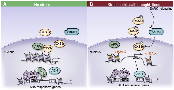 图3. 拟南芥OXS3家族蛋白通过ABI4调控ABA的信号传导以应对环境胁迫的工作模型。