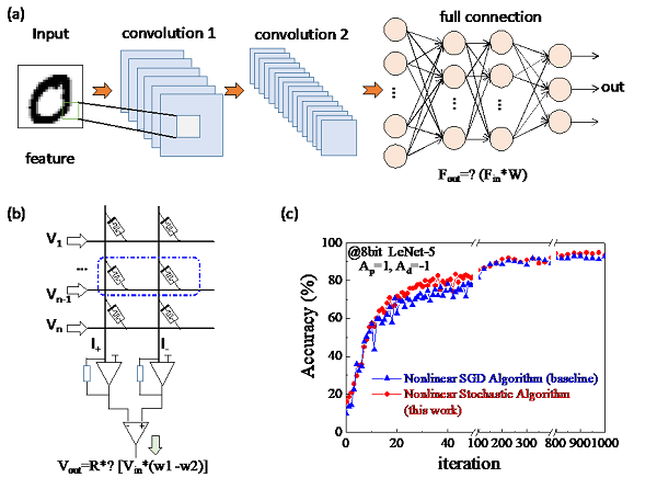神经网络已被广泛应用于各种人工智能技术,如计算机视觉和语音识别。然而,在传统互补金属氧化物半导体CMOS数字平台上运行的人工智能算法在很大程度上受到摩尔定律即将结束或冯·诺依曼架构限制的限制。因此,学术界提出了基于忆阻器阵列的存储计算模型(computing in memory)。传统的基于忆阻器阵列的权重更新,需要计算出具体的脉冲数,这需要构建复杂的外围电路来计算脉冲数。在新的学习方案当中,随机提取训练样本,基于训练样本更新整个卷积神经网络的权重,计算梯度值获取权重更新的方向,引入忆阻器非理想特性,给予忆阻器单脉冲进行权重更新,该方法不需要复杂的外围电路设计,大大节省了芯片面积和功耗。研究人员基于新的学习方案提出了四种权重更新方式,将传统的SGD和PL作为基准,在基于LeNet5网络对MNIST图像识别中取得了好的识别率。该方法可以应用到更加复杂的神经网络结构当中,如resnet8网络和VGG网络对cifar10数据集进行识别,具有良好的应用前景和优化空间。