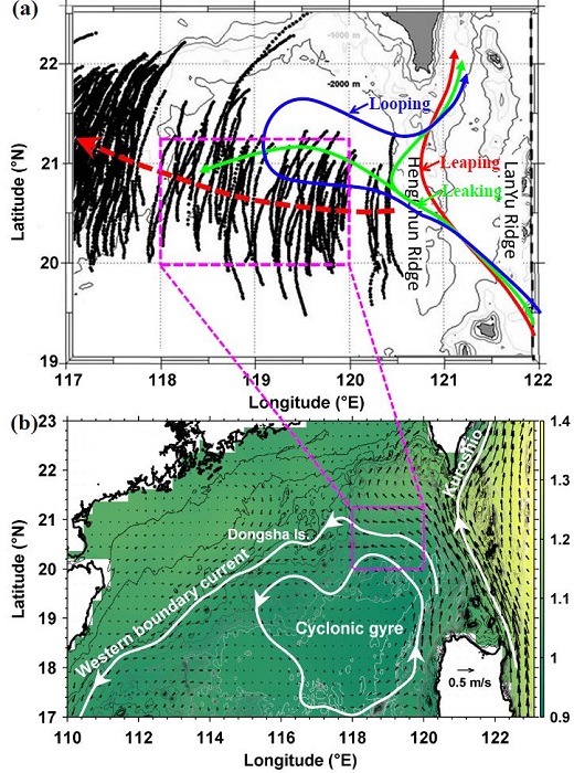 研究人员采用非线性折射数值模型探讨了1993-2015年间20多年来南海北部西边界流及三种不同黑潮入侵流径(如图1a的Looping、Leaping和Leaking)对跨南海北部深海海盆传播的内孤立波振幅、相速度等的影响规律。结果表明,从年平均环流角度看,上游的西边界流可造成内孤立波传播速度增加0.1~0.2 m/s、振幅减弱20~30 m。20多年中约有1/3时间,由大尺度环流引起的内孤立波传播速度变化超过了科氏效应引起的传播速度变化。在三种不同黑潮入侵流径中,Looping对内孤立波传播加速及振幅减弱的影响最为显著(振幅减弱可超过30m),而黑潮Leaping流径的影响最弱。造成上述差异的根本原因在于内孤立波对不同大尺度背景环流的响应差异所致。例如,Looping倾向于在研究区域诱发反气旋涡,涡致西向流与内孤立波传播方向相同会增强内孤立波沿波峰线的散射效应及传播的多普勒效应,从而导致内孤立波振幅减弱及传播速度加快;而Leaping在研究区域更容易诱发气旋涡,涡致东向流与内孤立波传播方向相反会减弱内孤立波的传播速度。