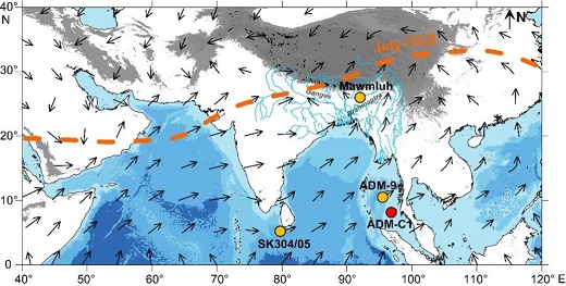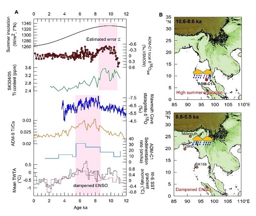 研究人员利用印度洋安达曼海南部沉积柱样ADM-C1中浮游有孔虫Globigerinoides ruber sensu stricto (s.s.) (white)的Mg/Ca和氧同位素,重建了该区域的表层海水温度和海水氧同位素变化(δ18Oseawater)曲线,发现热带印度洋区域的印度洋夏季风降雨量在过去10.6-8.6千年时最大,在过去8.6-5.0千年时有所减弱,在过去5千年以来进一步下降。同时,研究人员还发现该沉积钻孔中沉积物的沉积速率和敏感粒级结果在过去8.6-5.5千年时达到最高值,并认为这与东印度洋以北地区的河流集水盆地地区的降雨量和河流入海量有关。通过整合印度洋夏季风区域的其它古气候记录对比,研究人员认为在亚热带辐合带、厄尔尼诺和南方涛动(ENSO)和印度洋偶极子活动的共同作用下,印度洋夏季风最大降雨量在早全新世期间存在一个明显的经向移动过程,即热带东印度洋低纬区域的夏季风降雨量在过去10.6-8.6千年时达到最大,在过去8.6-5.5千年时向北移到了东印度洋以北的亚热带区域。