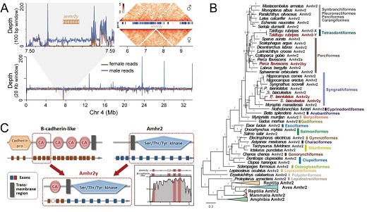 图5. 草海龙和绿海龙性别决定基因进化及其形成。(A)性别决定区域和性别决定候选基因;(B)amhr2y和amhr2基因在脊椎动物中的系统进化树;(C)绿海龙amhr2y基因形成示意图。