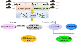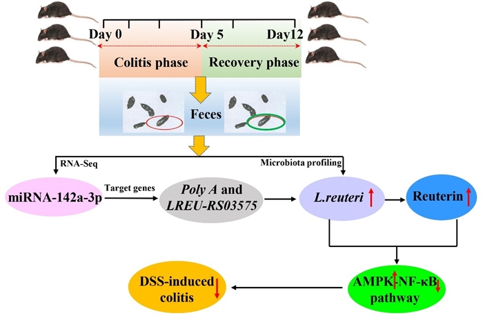 近期,中国科学院亚热带农业生态研究所畜禽健康养殖与农牧复合生态研究中心单胃动物营养研究团队开展深入研究,在miRNA精准调控肠道微生物结构从而改善肠道健康方面取得新进展。该团队研究发现,肠道炎症发生和恢复后其miRNAs组成存在显著差异,肠道炎症恢复后miRNA-142a-3p水平显著升高;miRNA-142a-3p通过靶向调控罗伊氏乳杆菌基因表达,从而显著促进其生长;罗伊氏乳杆菌及其代谢物罗氏菌素可显著缓解肠道炎症。该研究揭示了miRNA靶向调控肠道微生物从而促进肠道健康的作用机制,这为精准调控肠道菌群结构从而改善仔猪肠道健康提供有力支撑,也为后续益生菌饲料产品的研发提供理论基础。
