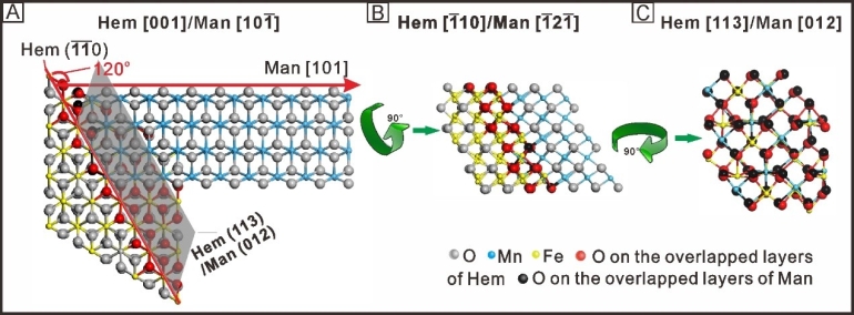 在众多矿物-水界面反应中,矿物颗粒的异相成核与生长过程不仅影响着铁/锰氧化物等矿物组分的生物地球化学循环,也显著影响环境物质的赋存形态与归趋。异相成核生长主要受溶质浓度及溶解度变化的制约;例如,受环境湿度、溶质价态、pH和温度等条件变化的影响。根据矿物不同晶面的构-性差异进行推测:纳米颗粒的异相成核还将受基底矿物晶面结构的制约。然而,当前人们对基底矿物的晶面结构如何控制新矿物的异相成核与生长的认识还十分薄弱。针对上述问题,中科院广州地球化学研究所矿物学与成矿学重点实验室刘晶、朱润良、何宏平等研究人员以锰氧化物在片状赤铁矿(暴露{113}和{001}晶面)和伪立方状赤铁矿(暴露{012}晶面)的氧化及结晶生长为例,从原子尺度揭示了Mn(II)的异相氧化及锰氧化物的异相成核生长机制。