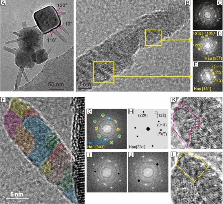 图三: (A-L) 伪立方状赤铁矿表面生长锰氧化物的TEM图及其对应FFT图