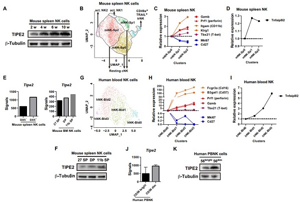 课题组前期已发现表达在细胞表面的卡控点受体TIGIT(Hepatology 2014a,2014b; Nat Immunol 2018)和A3AR(Cell Mol Immunol 2021)在疾病状态如肿瘤、组织损伤与再生等过程中对NK细胞的功能具有负调控作用。在上述研究基础上,我们考虑到NK细胞在稳态条件下的成熟过程对于NK细胞最优功能水平的获得至关重要,而我们对该过程中的负调控因子了解不多,为了进一步探索NK细胞的潜在卡控点分子,我们对正常状态下人和小鼠外周NK细胞进行了单细胞转录组分析,结果显示NK细胞在功能成熟过程中存在着对应NK细胞从“不成熟”到“成熟”分化过程的几个亚群,我们同时发现,早前被报道具有介导免疫耐受功能的TIPE2分子伴随着NK细胞的成熟而逐渐表达升高(图2),呈现出与NK细胞成熟相关的表达特征。