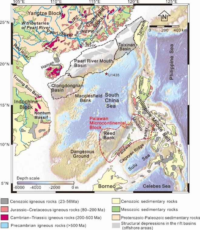 图1 南海及其周边地区地质图,红色虚线范围为巴拉望微陆块