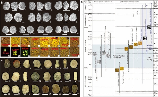 图2 (a)浮游有孔虫扫描电子显微镜照片,比例尺长200 μm; (b)钙质超微化石偏光显微镜照片(c)底栖有孔虫超景深三维体视镜照片,比例尺长200 μm;(d)浮游有孔虫和钙质超微化石(本研究及Wolfar et al., 1986)限定的Panas-Pandian组沉积年代