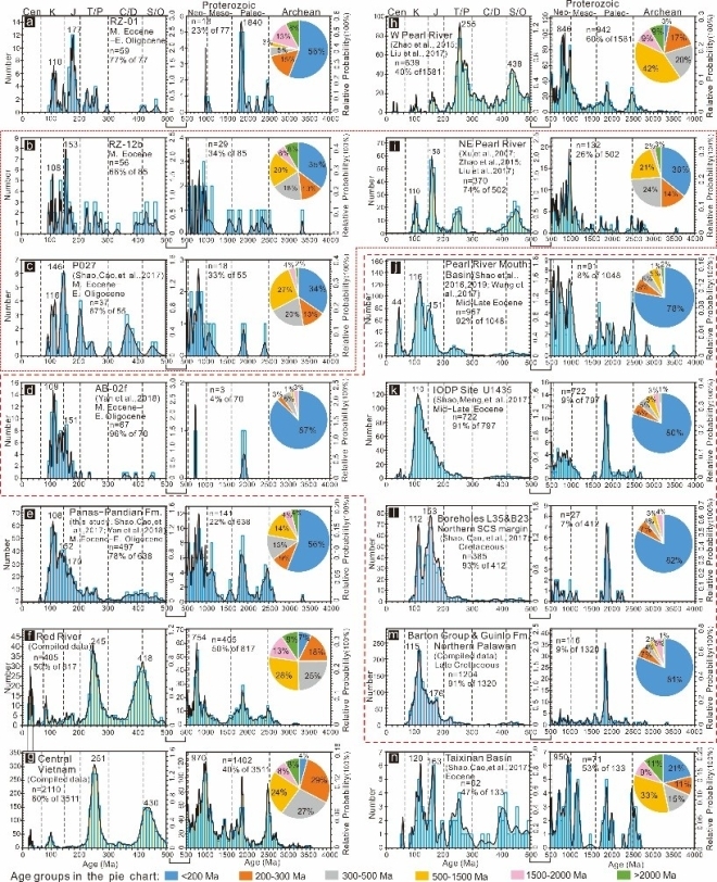 图3 Panas-Pandian组碎屑锆石U-Pb年龄谱(a-j),并与南海周边地区(f-i)及南海南北两侧陆缘白垩世-始新世地层(j-n)进行比较。Panas-Pandian组中,多峰分布模式的样品(b和c)对应于远源源区,单峰分布模式的样品(d)对应于近源源区