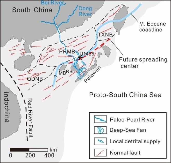 (2)微量元素、Nd同位素、重矿物组合和碎屑锆石U-Pb年龄(图3)分析显示Panas-Pandian组具有两个主要的源区:近源的中生代盆地基底隆起和远源的华夏地块内部。这暗示了一条类似于现今珠江东北支流的河流在中始新世(47.7–42.1 Ma)就已存在,并且可以穿越华南陆缘,将来自华夏地块内部的沉积物输送至陆坡位置的巴拉望中南部(图4)。这一沉积物输送路径表明南海海底扩张发生以前的华南陆缘为低地形梯度的宽裂谷带。