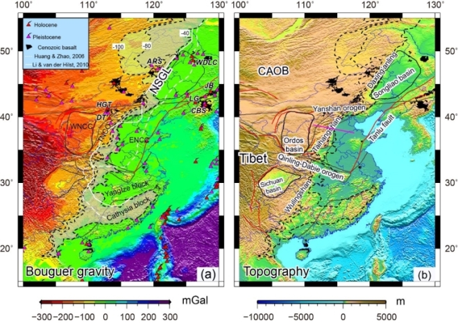 重力梯度带是全球重力异常图中非常引人注目的显著特征,大型或超大型线性异常在全球多达几十处。对于位于板块边缘和大洋板块内部的线性重力异常,一般可通过板块的边缘效应或软流层小尺度对流、岩石圈伸展/热收缩、软流层流动的“指缝”效应等基本模式得到合理解释。但发育在大陆板块内部的大型重力梯度带非常少见,中国东部的南北重力梯度带(NSGL)长~4000km,从俄罗斯西伯利亚延伸到华南,该区重力异常在较窄范围内由 -100 mGal 陡增到 -40 mGal (图1),且在其东西两侧,地形地貌、构造形迹、岩浆活动,以及地壳、岩石圈厚度等均存在差异性,其形成机制有待进一步揭示。
