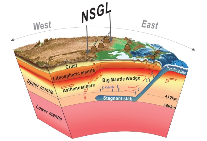 图2. 南北重力梯度带的形成机制示意图。 早白垩世西太平洋板块的后撤导致俯冲板片在地幔过渡带大范围滞留并形成大地幔楔系统,地幔楔内部的物质对流和地幔过渡带的挥发物(包括水和二氧化碳)弱化并改造上覆岩石圈,从而导致南北重力梯度带的形成