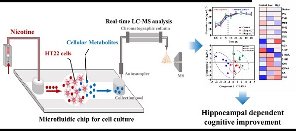 尼古丁是烟草烟雾中的一种天然活性成分,经吸食香烟或二手烟暴露后可穿过血脑屏障进入大脑,对大脑功能发育、学习、记忆等方面产生影响。海马区神经递质的变化与认知功能密切相关,解析尼古丁对海马区中神经递质代谢的变化是阐明其对认知功能影响机制的重要方法之一。传统检测手段难以实现对神经递质实时和高通量检测,本研究使用集成了细胞在线培养和液相色谱-质谱实时分析的微流控芯片-液相色谱-质谱(MC-LC-MS)系统,对小鼠海马神经元HT22细胞进行在线培养及尼古丁暴露与戒断,并实时监测尼古丁暴露与戒断对海马神经递质代谢的动态影响(图1)。
