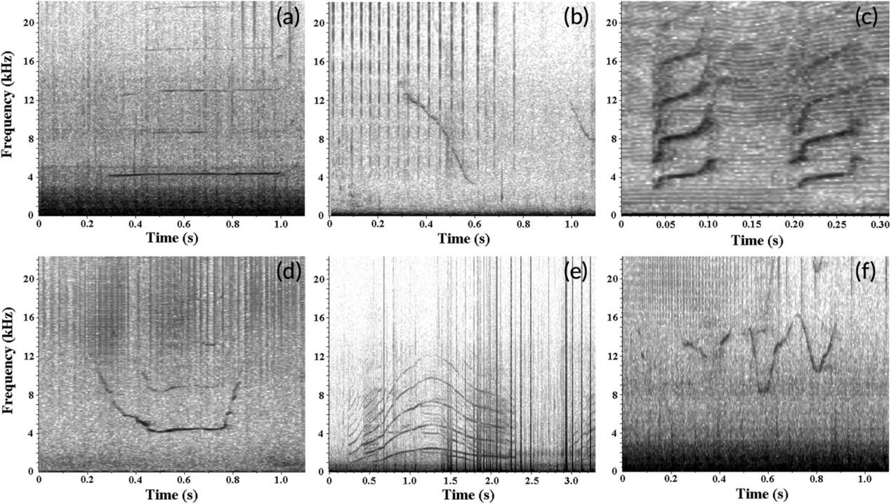 图1 本研究记录到的中华白海豚哨叫声6种哨叫声声谱图:(a)直线型,(b)下扫型,(c)上扫型,(d)凹型,(e)凸型,(f) 正弦型