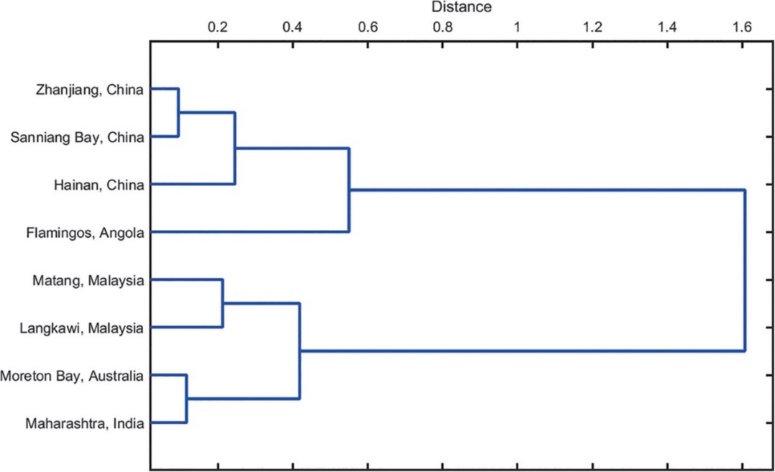 图2 不同驼海豚地理种群哨叫声特性相似性的分层聚类结果
