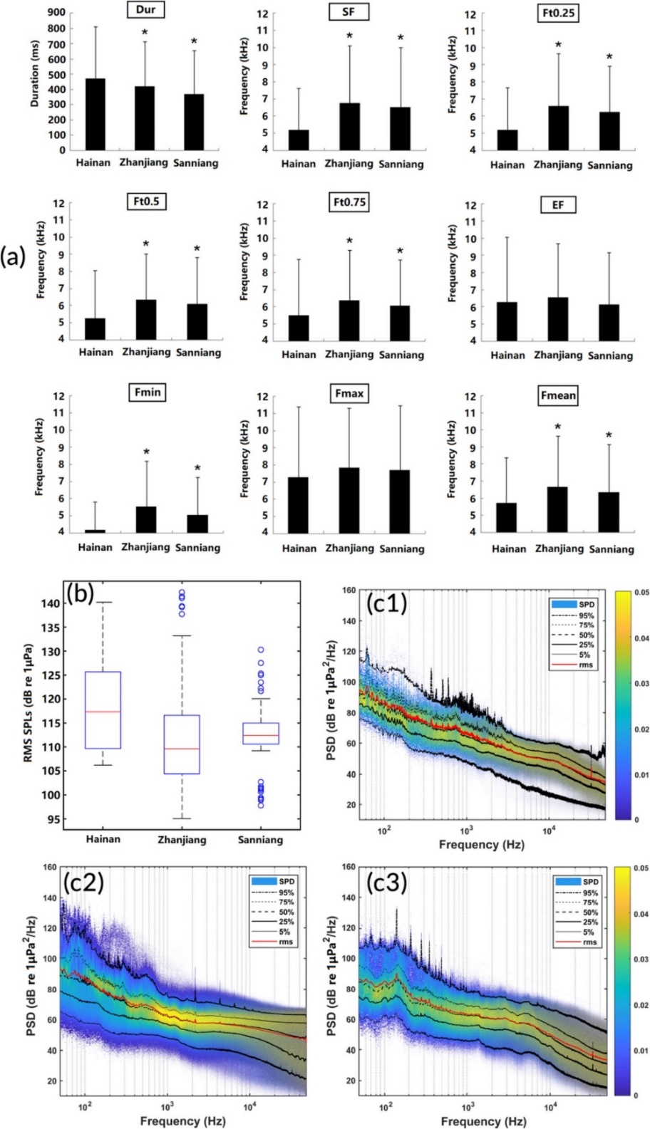 图3 海南、湛江和三娘湾中华白海豚地理种群9个哨叫声参数比较(a),50-48,000 Hz范围内的宽频水下噪声SPLs(b),环境噪声功率谱密度(PSD)和频谱概率密度(SPD)(c1、c2、c3)