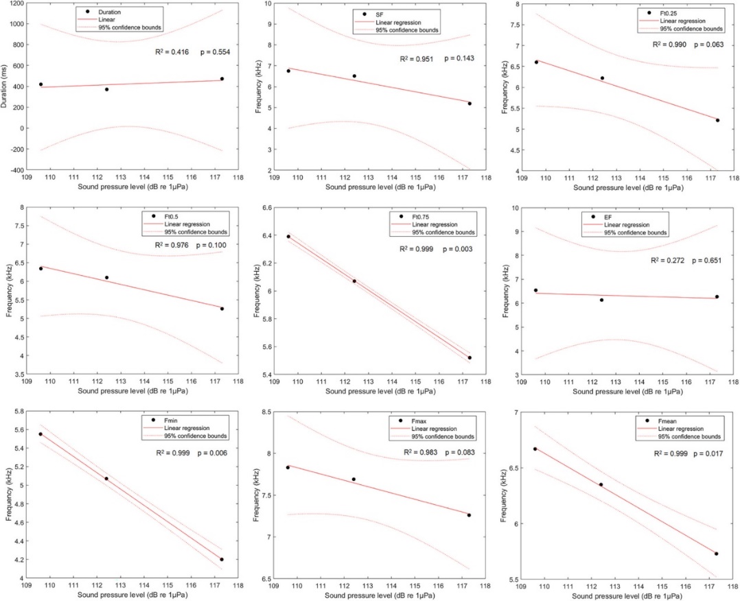 图4 海南、湛江和三娘湾中华白海豚地理种群9个哨叫声参数与当地栖息地宽频水下噪声SPLs 的线性回归分析