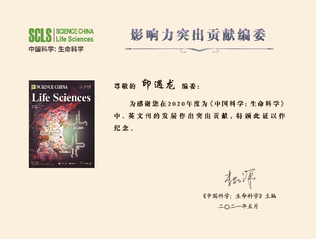 印遇龙院士被评为《中国科学:生命科学》期刊“2020年度影响力突出贡献编委”