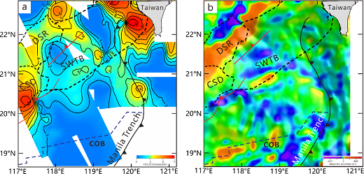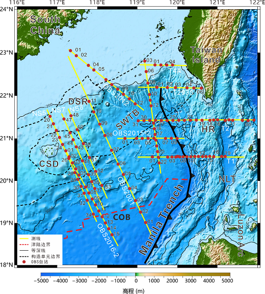 DSR:东沙隆起 CSD:潮汕坳陷 SWTB:台西南盆地 HR:恒春海脊 NLT:北吕宋海槽 COB:洋陆边界