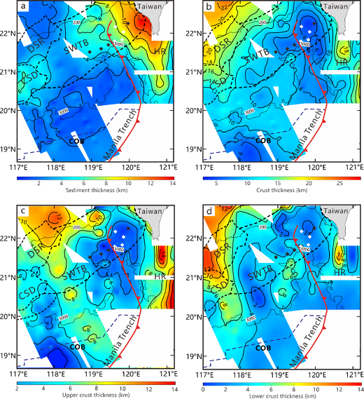 (a)沉积层厚度分布图;(b)地壳厚度分布图; (c)上地壳厚度分布图;(d)下地壳厚度分布图
