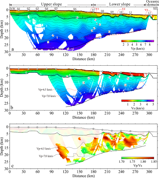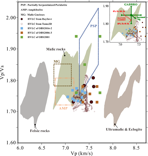 研究人员收集了东沙海域采集的OBS数据(NS5测线),运用反演方法获取了P 波、S 波和Vp/Vs数据的结构模型。结果显示,下地壳高速体的Vp 为 7.0–7.5 km/s ± 0.05–0.25 km/s,Vp/Vs为 1.70–1.82 ± 0.05,表明其成分以基性为主,为后期岩浆侵入形成的富镁辉长岩。
