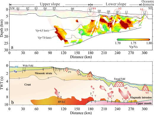 研究认为南海东北部洋-陆过渡带地壳拉张减薄程度剧烈,形成了大量伸展性断层,后期岩浆易沿断裂向浅部迁移,使得深部镁铁质岩浆侵入程度向海增大(Vp/Vs有向海增大的趋势),这导致下地壳高速体厚度在洋测更薄。该研究为深入认识南海北部陆缘岩浆活动及地壳伸展提供了重要信息。