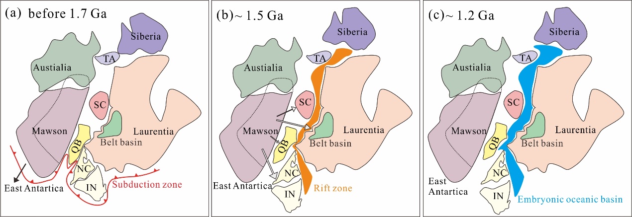前人研究发现哥伦比亚超大陆中心为Laurentia古陆,其西部被Mawson陆块以及澳大利亚陆块所围绕,而华北克拉通位于Laurentia古陆西南部(Hou et al.,2008)。而祁连地块具有与上述地块相一致的古元古代和中元古代碎屑锆石年龄峰。因此,祁连地块很可能位于古伦比亚超大陆西南部(图2)并经历了以下演化:古元古代,哥伦比亚超大陆受俯冲作用影响,发生超大陆汇聚,致使祁连地块发育有陆缘弧岩浆作用(图2a);中元古代早期(约1.5 Ga),哥伦布亚超大陆裂解,伴随有祁连地块发育陆内裂谷型岩浆作用(图2b);随着裂谷作用的扩张,在中元古代晚期(约1.2 Ga)形成了早期洋盆,从而在祁连地块出现洋岛型玄武岩(图2c)。