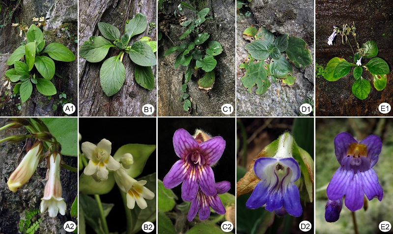 图 . A:淡黄报春苣苔, B:多色报春苣苔, C:湖南报春苣苔, D:多葶报春苣苔, E:遂川报春苣苔。