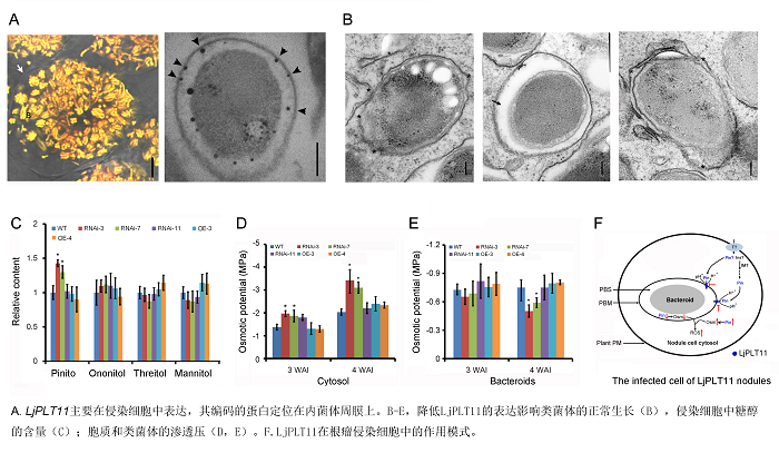 以及胞质和类菌体中渗透压水平(D, E)。F. LjPLT11影响根瘤发育的可能机制。