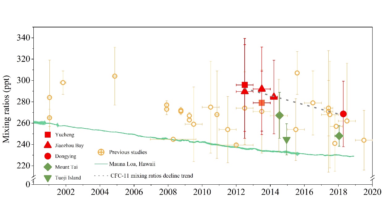 图1. 本研究报道的CFC-11浓度(实心)与前期文献报道的CFC-11浓度(空心)。浅绿色实线为NOAA MLO全球背景站2000 - 2018年CFC-11浓度变化;灰色虚线为在山东观测到的CFC-11浓度呈下降趋势。
