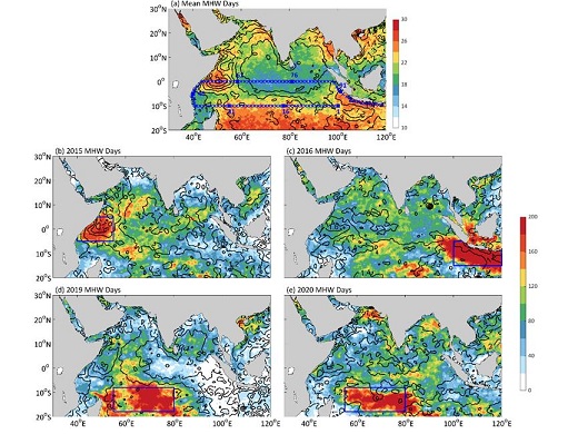 图1. 年平均海洋热浪发生总天数(填色,天)和平均强度(等值线,℃)。(a)热带印度洋气候态年平均的海洋热浪发生总天数(填色,天)和平均强度(等值线,℃),(b-e)分别为2015、2016、2019和2020年海洋热浪发生总天数(填色,天)和平均强度(等值线,℃)