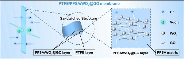 大力发展利用绿色能源是实现“碳达峰、碳中和”目标的必经之路。到2030年,风能、太阳能等的总装机容量将达到12亿kW以上。而风能、太阳具有不连续、不稳定等特点,需要配套大型储能系统使用。其中,液流电池是一种极具发展潜力的大规模能源存储系统。全钒液流电池(VRFB)具有独立的功率和容量、高可靠性和灵活性,是最有前途的液流电池之一。在液流电池中,离子交换膜用于防止阴极/阳极短路、避免电解质交叉和副反应发生,同时允许质子传导而保持电池电中性。迄今为止,全氟磺酸(PFSA)膜是VRFB中应用最广泛的离子交换膜。但由于PFSA膜的钒离子渗透性严重,导致电池寿命短和性能不理想,阻碍了VRFB进一步应用和发展。