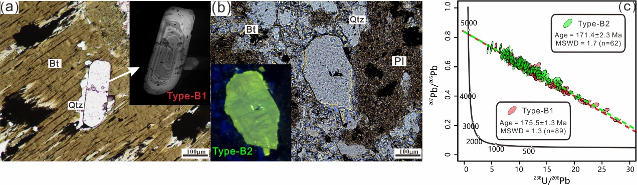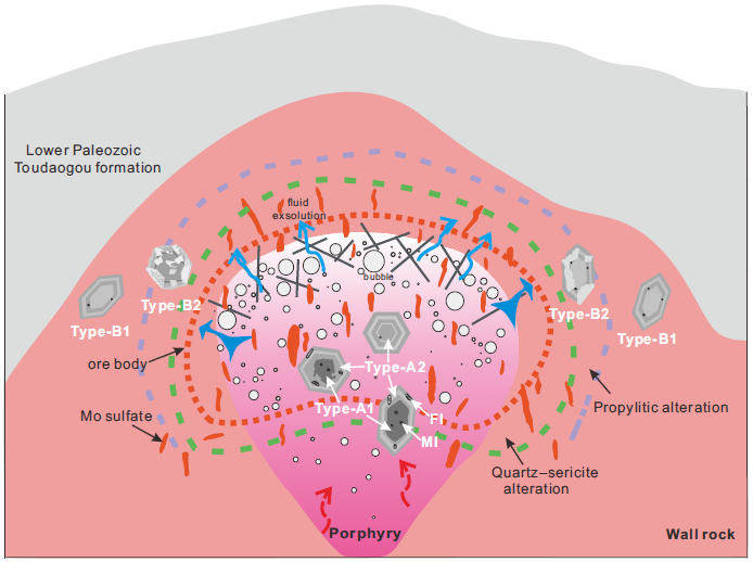 斑岩型矿床是全球铜钼的主要来源,提供了全球60%的铜和95%的钼。通常认为斑岩型矿床的形成与长英质斑岩体的高度岩浆-热液演化和岩浆后期强烈的流体交代作用密切相关。但是,在斑岩成矿模型中,这些所谓的岩浆-热液过渡演化和流体交代成矿过程一直缺乏有效的、令人信服的矿物学记录。