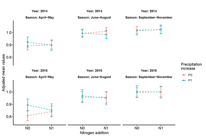 误差棒代表95%置信区间。N0:未添加氮;N1:氮添加;P0:无降雨量增加;P1:降雨量增加。