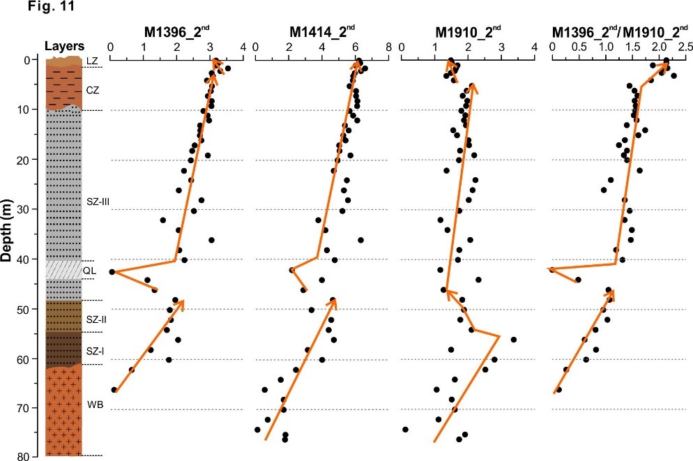 研究还发现,由均一原岩形成的风化壳的光谱参数具有连续性变化特征,因而M1396_2nd、M1910_2nd、M1414_2nd和M1396_2nd/M1910_2nd等光谱参数沿风化剖面变化趋势可作为识别风化壳原岩变化的判定依据(图2),也是有效示矿指标之一。