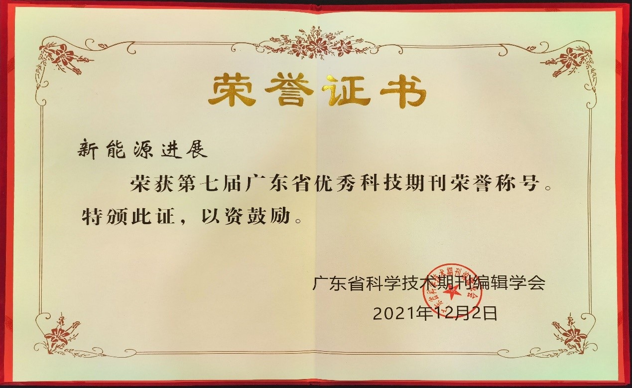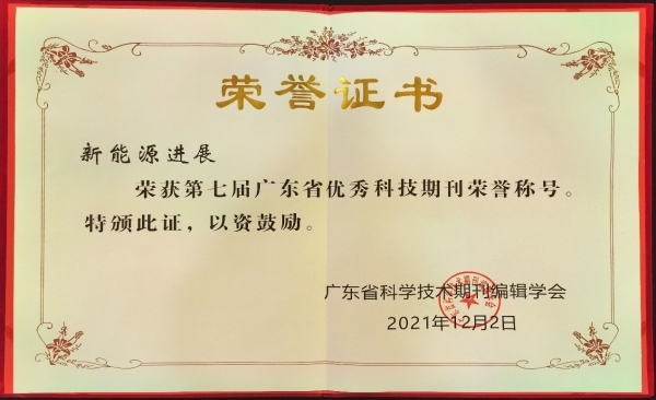 近期,在广东省科技期刊编辑学会举办的第七届广东省科技期刊评优活动中,中国科学院广州能源研究所主办的《新能源进展》,经材料申报,学工委审查,专家组、委员会评审,常务理事会、理事长办公会审议、公示等环节,被评为第七届“广东省优秀科技期刊”。