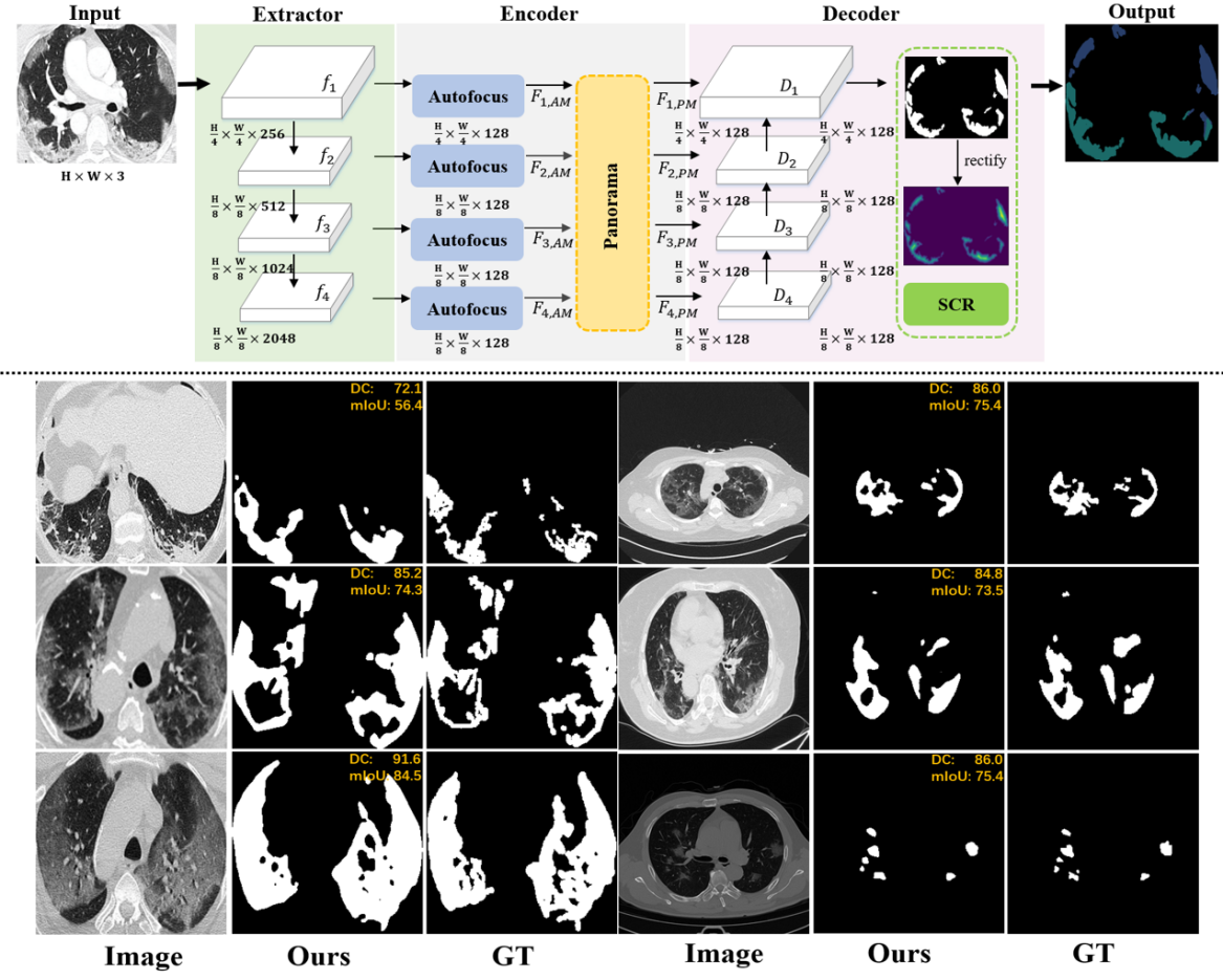 针对上述问题,团队提出了一种基于聚焦-融合-修正的深度网络架构,通过设计的自动聚焦和全景聚合模块自适应的、整合了网络同级和跨层级的上下文信息,有效缓解了由于病变分布散乱、形状不规则等造成的识别精度低问题。进一步,网络架构中引入结构一致性修正机制,在学习过程中利用距离映射对每个像素及其周围区域进行编码,有效将区域的结构信息引入学习过程,提高了模型对复杂病变结构的感知,降低了其它信息的干扰。在新冠肺炎CT影像分割应用中,分割效果超过近期提出的多种深度学习方法。