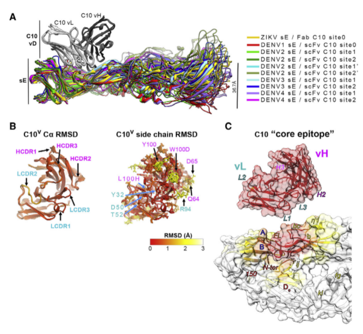 用拥有广泛中和潜力的C10单价抗体对病毒进行结合能力和中和能力实验,发现其仅对ZIKV和DENV1仍然具有中和活性,而对其它类型则失去了抗原中和的能力。为了解释这一现象,该研究首先通过体细胞超突变恢复突变,以及抗体与表位互补位的丙氨酸扫描突变验证了病毒互补位对于突变的耐受稳定性。随后通过X射线晶体衍射技术分别解析了多种抗原抗体复合物结构,通过对每个最小非对称单元中的E蛋白单体结合单价C10抗体复合结构RMSD值进行比较,发现ij loop上发夹结构(ij loop hairpin)的多种构象,如图1。