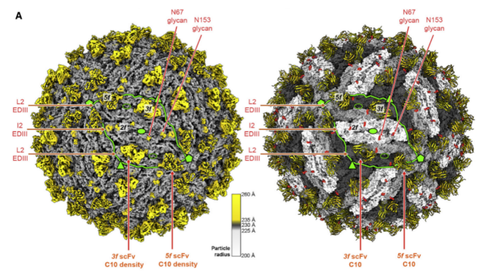 为进一步解释这种具体影响,解析了DENV-2病毒颗粒结合C10 scFV的复合体3.3 ?分辨率冷冻电镜结构,如图2所示。发现仅在病毒二十面体5次轴和3次轴附近的表位存在结合,而缺失在2次轴表位的结合。