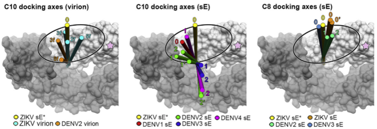 分析发现这一现象是因为附近结构中N67位点糖基化导致。如图3,为躲避图中粉色五角星标示的糖基化位点,DENV2-4中相应方向均背离N67糖基化位点偏离。相比之下,由于ZIKV没有该位点,所以并未受此影响。更进一步分析表明,抗体HCDR3环在其它几种病毒中的摆动导致部分表位无法结合。