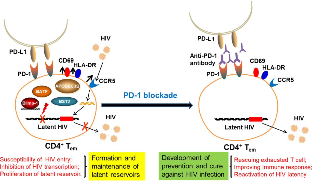 寻找潜伏感染艾滋病毒储存库的分子标记是实现艾滋病功能治愈的关键。研究者发现表达PD-1的CD4+ T细胞有利于艾滋病毒入侵并具有利于储存库形成的特性,进一步证实艾滋前病毒基因组在这群细胞中显著富集,体外PD-1抗体可以激活HIV病毒储存库。重要的是,SIV慢性感染猕猴在接受了ART和PD-1抗体治疗后,能够提高猕猴的艾滋特异性免疫应答,但在PD-1治疗期间中断ART治疗后,病毒载量速度反弹至峰值,加重了艾滋疾病的进展。