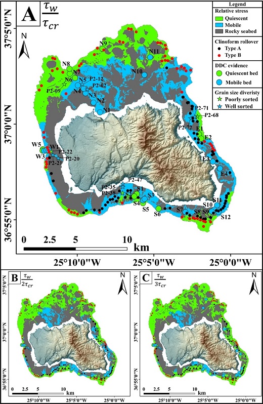 研究人员以葡属亚索尔群岛内的圣玛利亚海岛(Santa Maria Island, Azores)为研究对象,利用采集于海岛陆架区112个站位的表层碳酸盐沉积物样品,和该区域高分辨率风浪场特征,基于传统公式数值模拟极端风浪在海底产生的剪应力强度与沉积物沉积阀值之间的对应关系。结果显示,近乎整个海岛陆架区都的沉积物都应该在极端风浪的作用下侵蚀向深海搬运。然而这与研究人员在海岛陆架区获得的地球物理、海底地貌和海洋沉积学三种观测证据完全相悖。